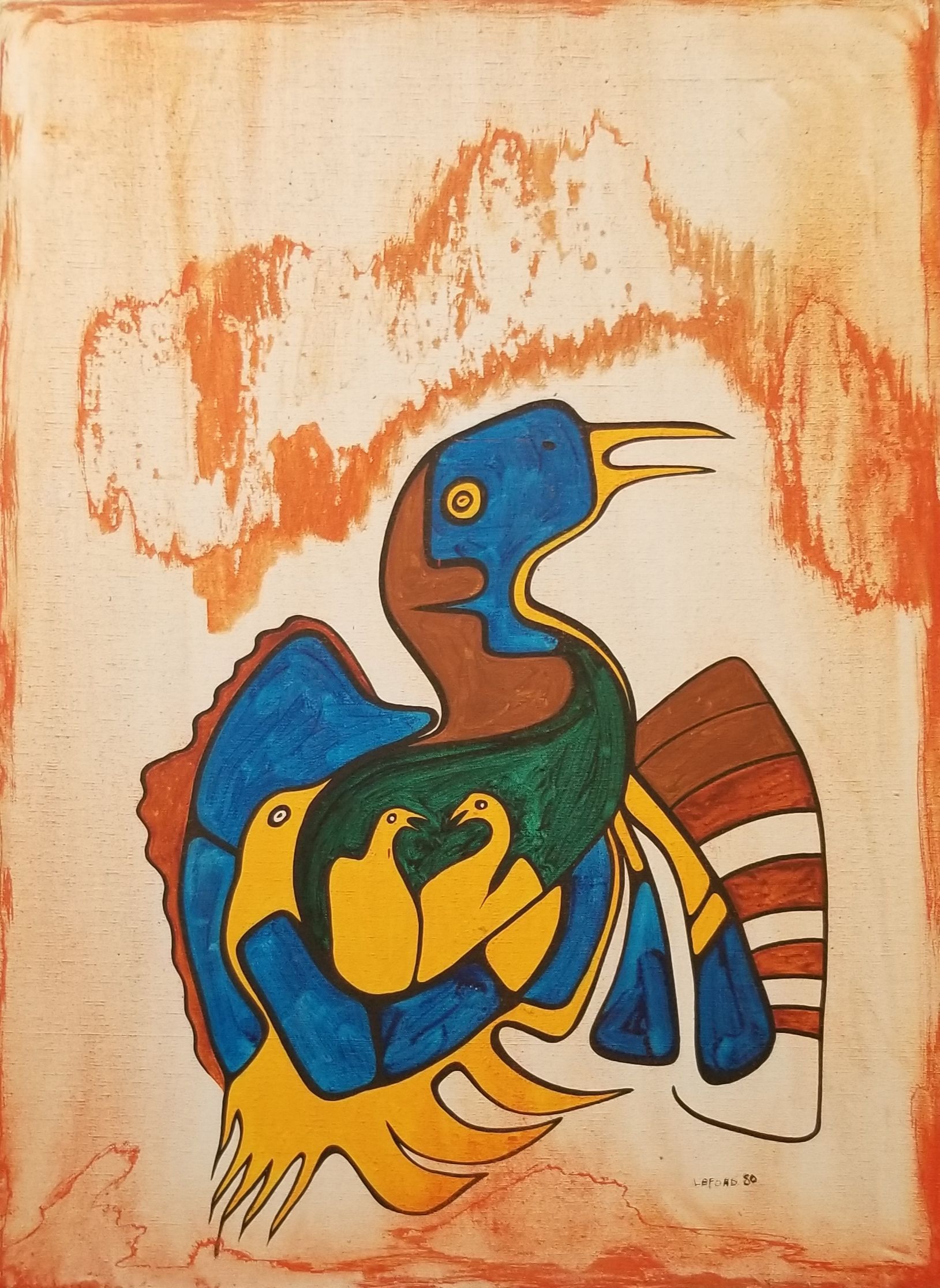 Laford a donné vie aux visions, aux histoires et aux légendes de ses aînés à travers de magnifiques peintures. Il travaillait avec divers matériaux — papier, écorce de bouleau, toile, pin, cèdre et pierre à pipe — créant de puissantes représentations de la création où se mêlaient esprits, aînés, animaux, oiseaux et plantes. Ses couleurs éclatantes et ses compositions géométriques complexes illustraient avec intensité l’interconnexion entre le monde animal et le monde spirituel.