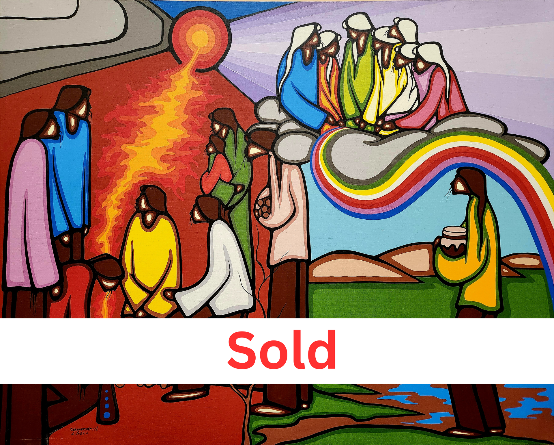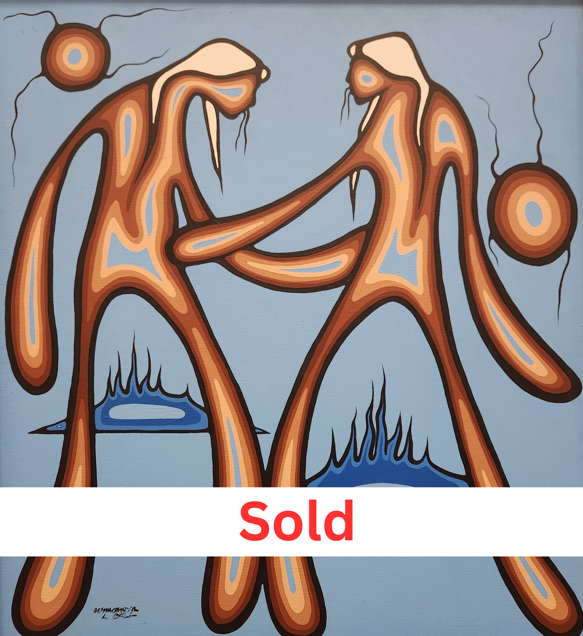 His artistic journey began in 1972 under the mentorship of the Professional Native Indian Artists Incorporation, known as the “Indian Group of Seven.” Officially starting his painting career in 1976, Elder Bell developed a distinctive style influenced by the Woodland School, featuring stylized figures that convey nurturing, peace, and serenity, often inspired by his family and friends.