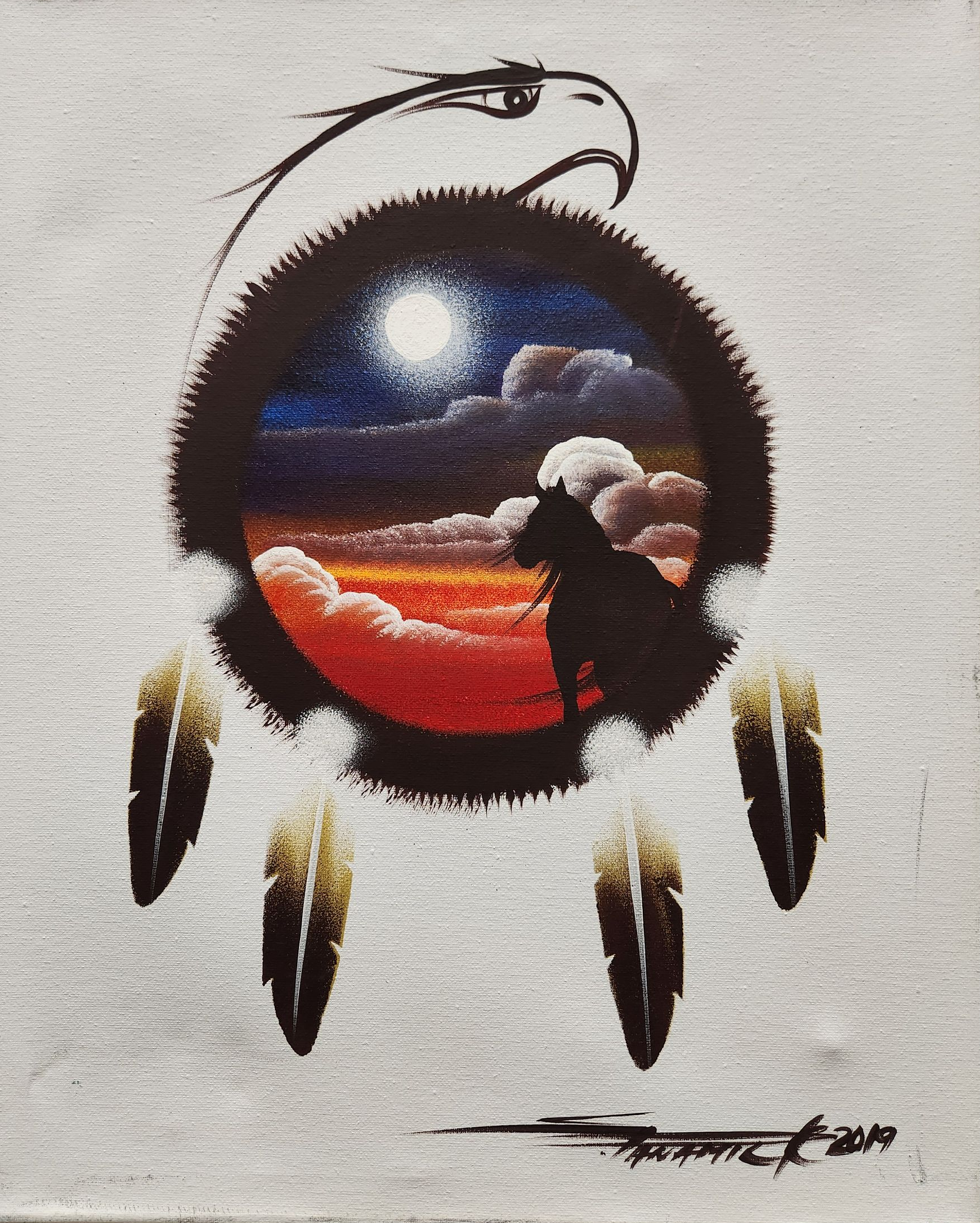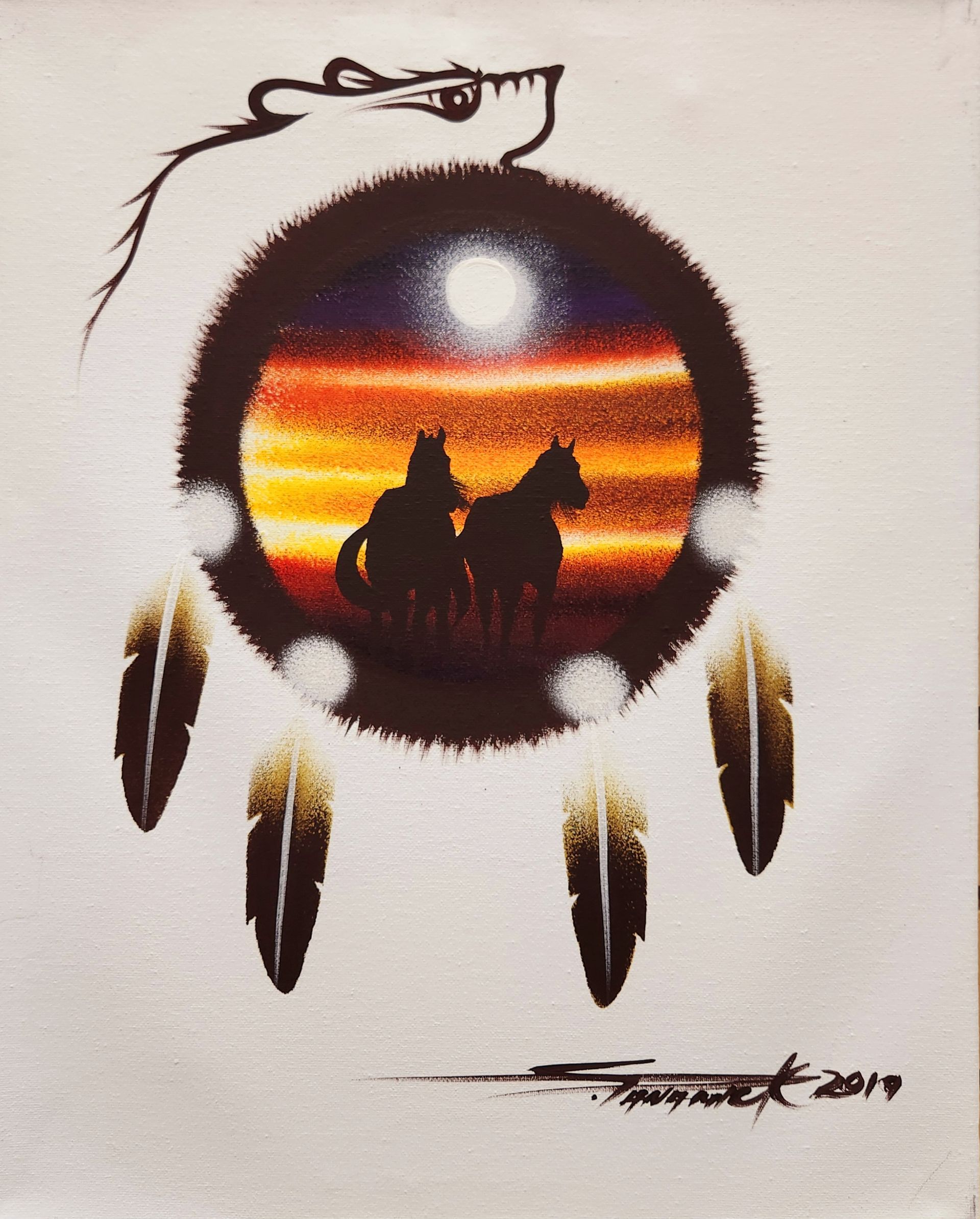 A proud member of the M’Chigeeng First Nation on Manitoulin Island, Stanley’s artistic journey began in his late teens, when he discovered a deep passion for the Woodland art style. This distinctive form of art, renowned for its bold, expressive colours and its intricate storytelling, captured the essence of the world through Stanley’s eyes. It was through the teachings of his older brother, the late Martin Panamick, that Stanley honed his craft and found his voice as an artist. Martin’s mentorship guided Stanley, enriching his understanding of the cultural and spiritual traditions of their Ojibwe heritage.